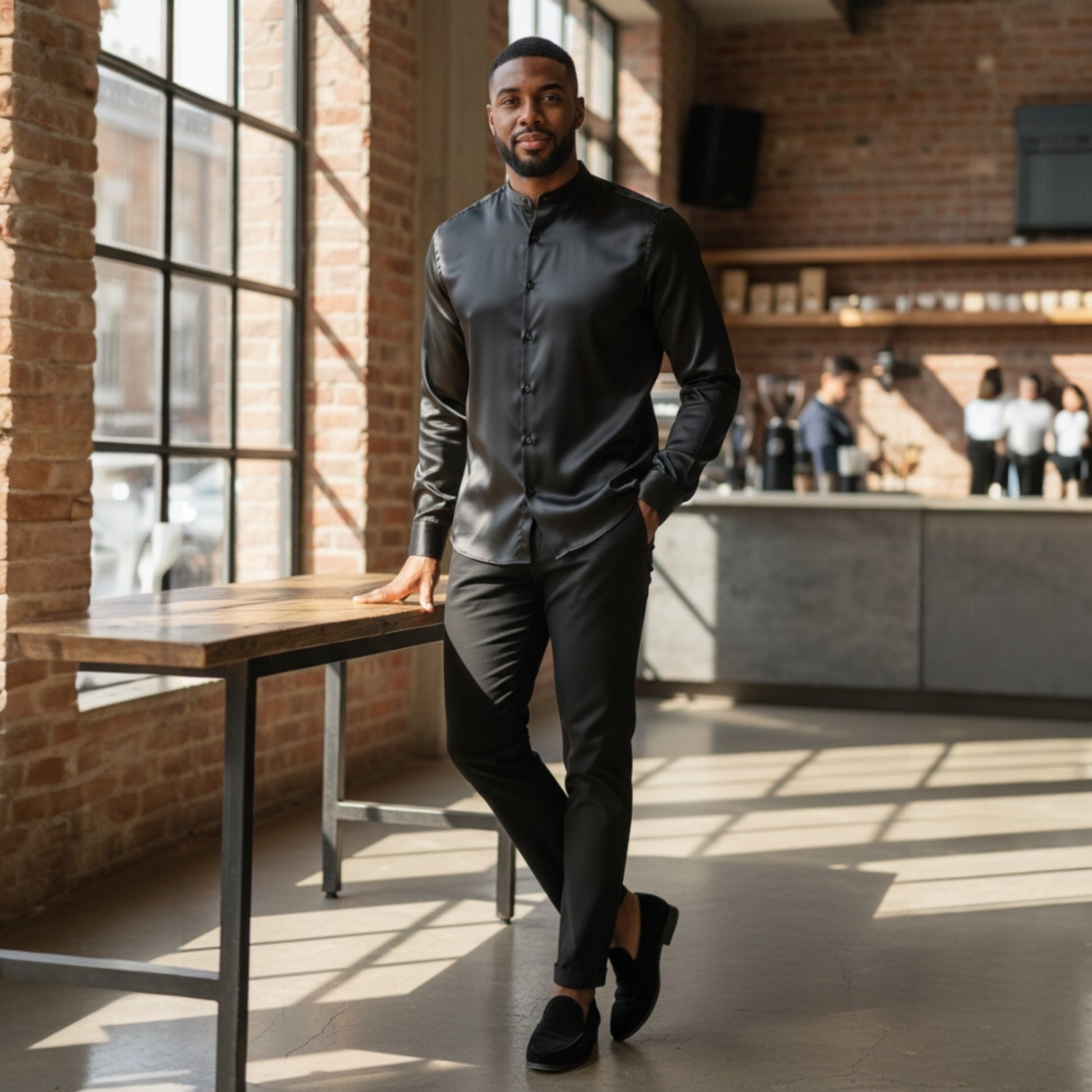 This sophisticated satin shirt features a distinctive banded collar and smooth button-front closure, delivering understated elegance for any occasion. Crafted from luxurious satin fabric, it drapes beautifully while maintaining a refined silhouette. Whether worn to formal gatherings, upscale social events, or layered into contemporary everyday looks, this versatile piece elevates your personal style with timeless polish and contemporary flair.