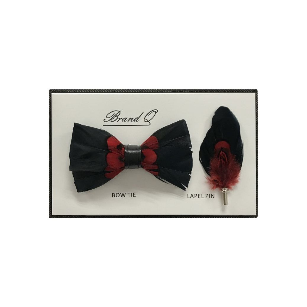Black Red Feather Brackish Bowtie With Feather Lapel Pin
