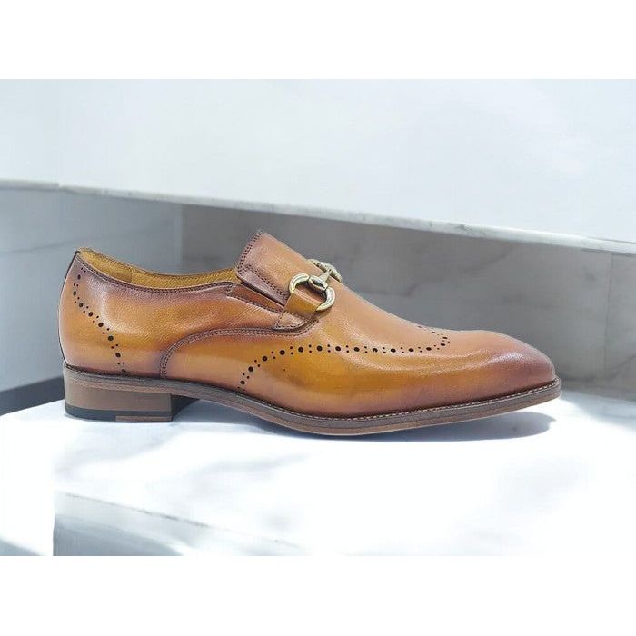 Step into luxury with the Carrucci Cognac Leather Sole Horsebit Loafer Shoe - KL901-01. Crafted with premium leather and designed for a comfortable fit, these loafers exude sophistication and style. KL901-01 Stylish Burnished Calfskin slip-on Shoe features a Double Gore for your perfect fit, soft leather lining, Decorative Perforations in a Wingtip design, extra soft cushion foot bed for comfort, a clean welt, and a Leather Sole.
