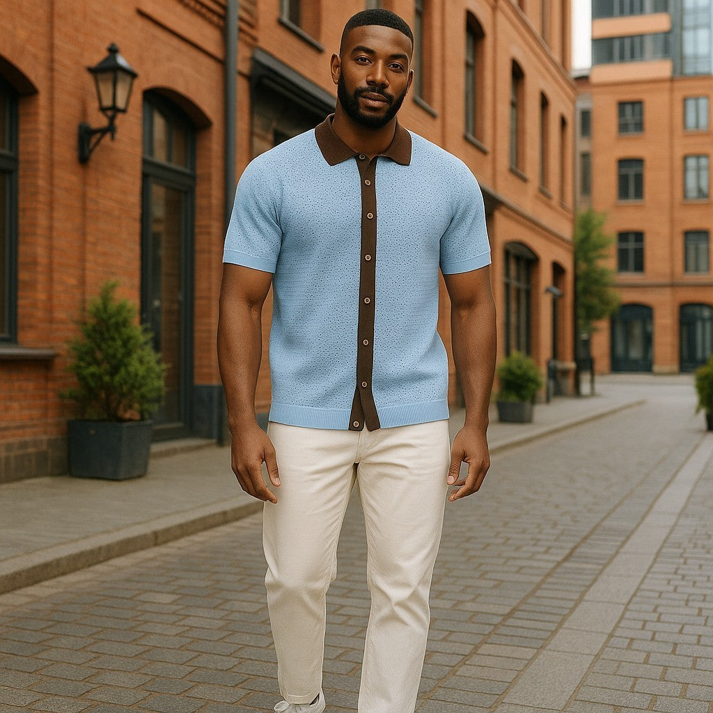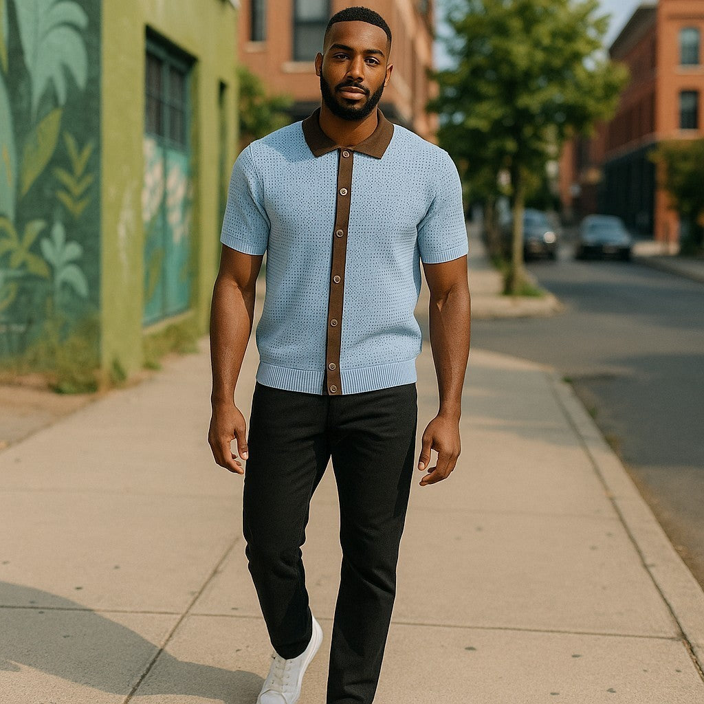 The Couture Sky Blue Brown Button Up Collar Shirt (KS-1562) features a luxurious design crafted from high-quality materials, offering comfort and durability. Its versatile style makes it perfect for any casual occasion.