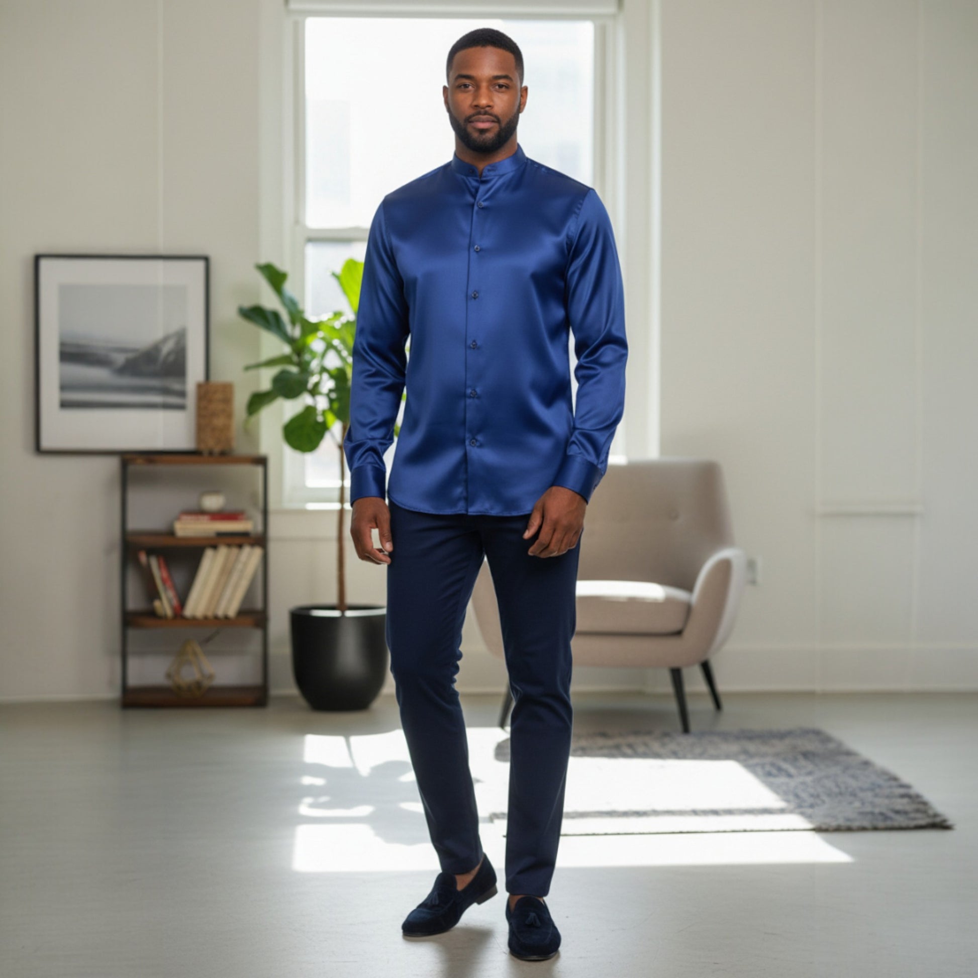 Elevate your wardrobe with this effortlessly stylish button down satin shirt with a banded collar.