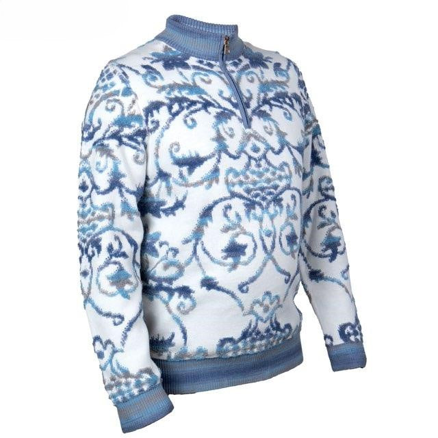 Elevate your style with the Prestige Original White Blue Half Zip Sweater - a premium quality garment that exudes sophistication and versatility. Its stylish design makes it a must-have addition to any fashion-forward wardrobe. Level up your look with this classy sweater today! Style SW-223