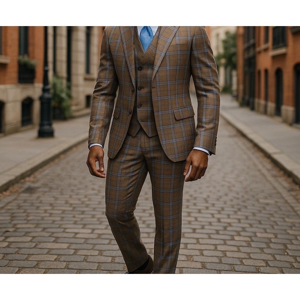 Tiglio Brown Blue Plaid One Button Wide Peak Lapel Double Breasted Vest Suit