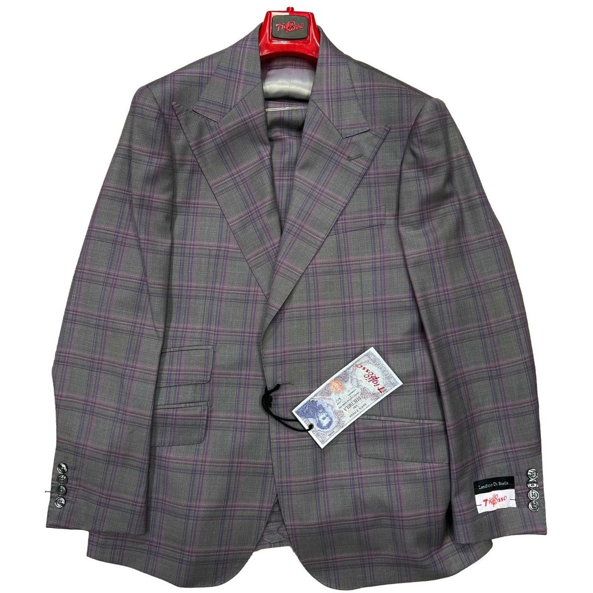 Tiglio Medium Grey Purple Magenta Plaid 3 Piece Suit TL3319 The Tiglio Orvietto model features a One-Button Jacket with single pleat classic fit pants, sans belt on the sides with suspender buttons. The vest is 6X3 U shaped for the optimum look. Own the room with this suit.