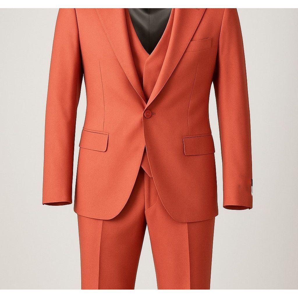 The Tiglio Rosso Orvietto Coral 3 Piece Suit combines an elegant design with premium craftsmanship, offering a versatile coral tone that suits both formal and festive occasions. Perfectly tailored for a refined and modern look. Tiglio Rosso suits feature many details only found in top notch custom made garments. Truly unique fabrications, innovative models, rare linings and buttons, and a flattering yet comfortable fit are part of every Tiglio Rosso garment. The Tiglio Rosso collection consists mostly of three piece suits and double breasted vests, and mostly in the semi-wide leg fit.