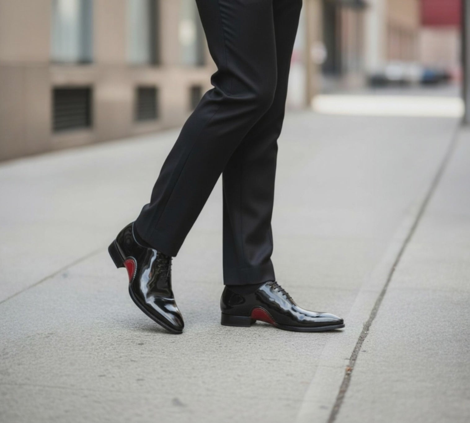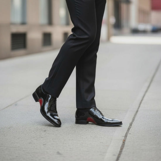 The UGo Vasare Oxford Dress Shoes combine timeless elegance with modern sophistication. Crafted from premium patent leather in a sleek Cooper Black finish, these shoes feature a striking red bottom for added style. Designed for a comfortable fit, they are perfect for formal occasions or elevating your everyday wardrobe.
